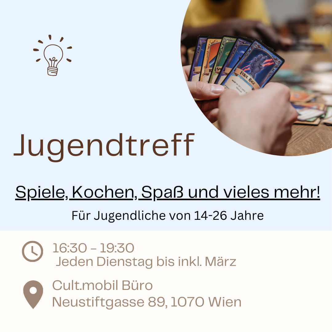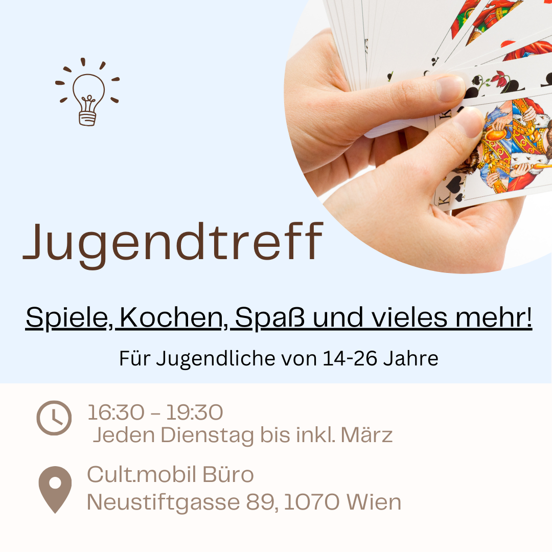 Bis Ende März 2024 findet jeden Dienstag von 16:30 bis 19:30 ein Jugendtreff im Cult.mobil-Büro statt.