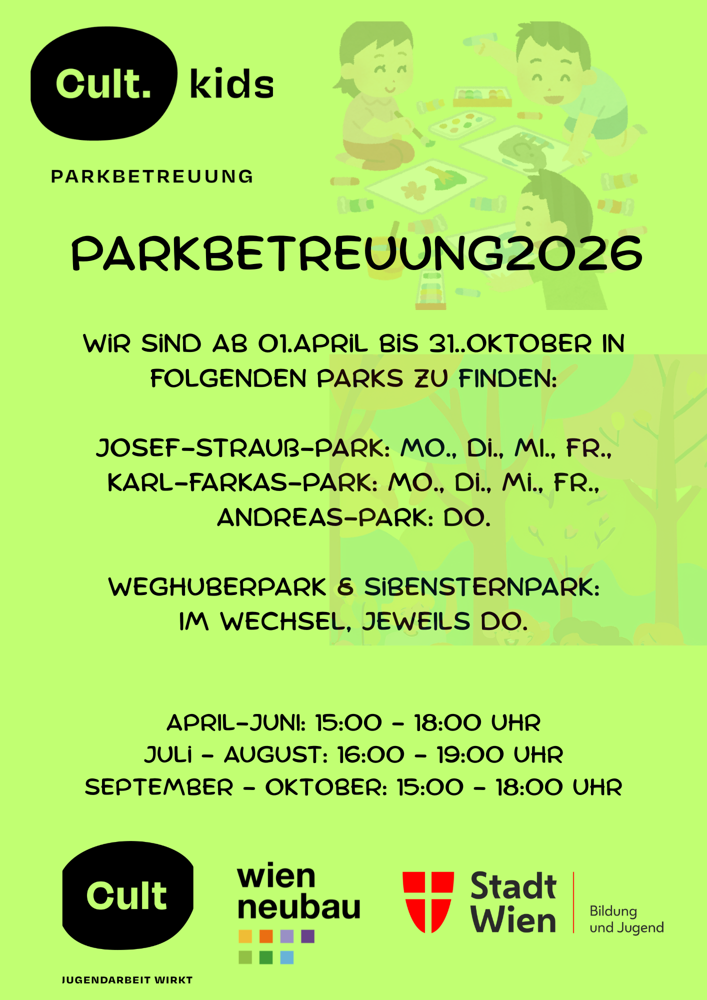 Ab April ist es wieder soweit! Wir starten in die Parkbetreuungssaison.....Hier seht ihr wann wir wo sein werden! Das Team von Cult Kids freut sich auf euch!!!
